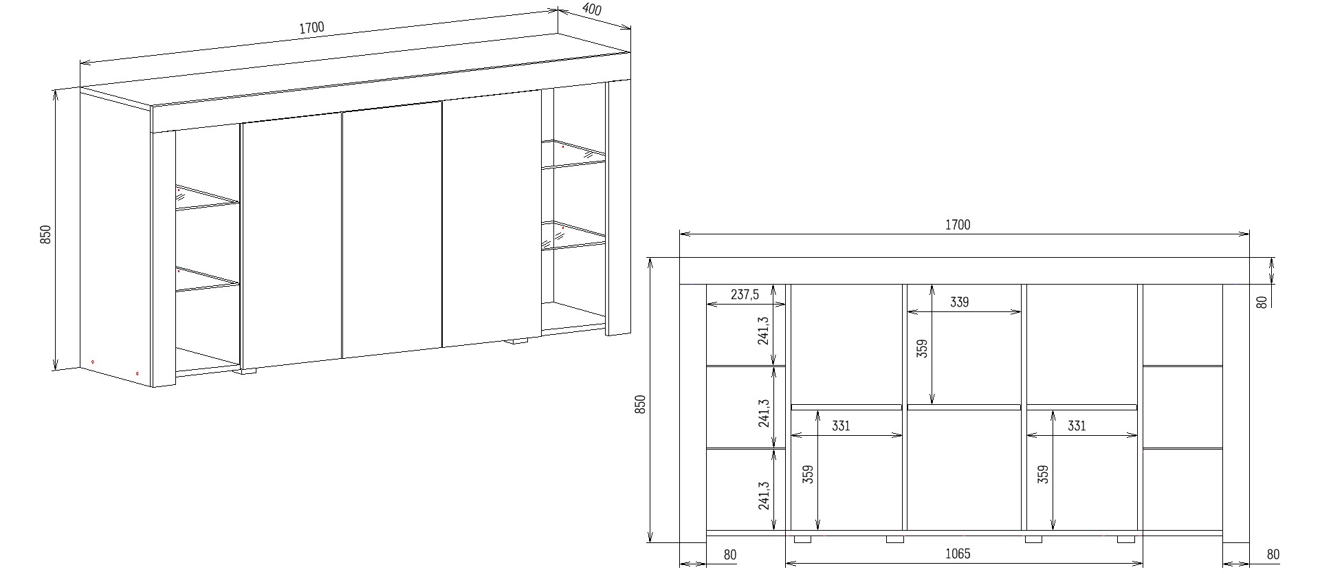 Модель оснащена тремя распашными дверцами. За каждой дверцей находятся два вместительных отделения с полками, что обеспечивает удобное хранение одежды, белья, посуды, документов и других вещей. По бокам комода предусмотрены открытые секции со стеклянными полками для декора или полезных мелочей.