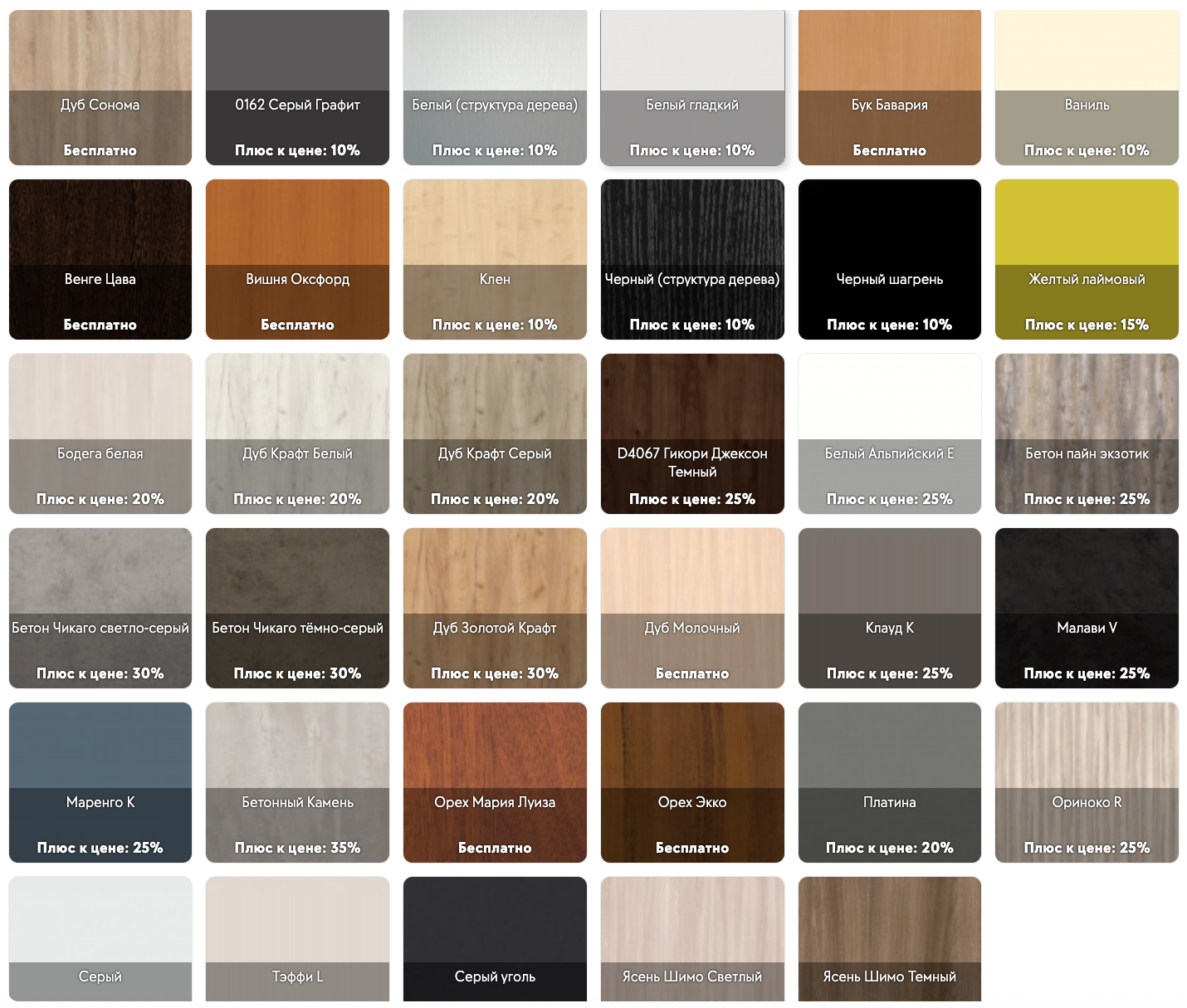 Белый гладкий / Белый гладкийЧерный шагрень / Черный шагреньВенге / ВенгеСерый / СерыйОрех Мария Луиза / Орех Мария ЛуизаДуб молочный / Дуб молочный
