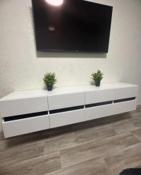 Тумба может быть выполнена в нужных размерах, что позволяет подобрать оптимальный вариант под конкретное помещение и параметры телевизора. При необходимости внутренние секции можно дополнить полками из ЛДСП или стекла. Дверцы открываются от нажатия, благодаря чему фасады выглядят особенно лаконично и современно. Надежная фурнитура обеспечивает комфортное и плавное открывание.