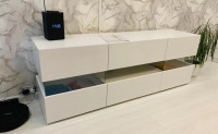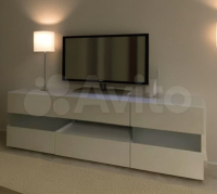 За фасадами расположены удобные секции для хранения техники, аксессуаров, документов и декоративных предметов. Провода можно аккуратно скрыть за задней панелью, чтобы телевизионная зона выглядела аккуратно и организованно. При необходимости тумбу можно дополнить стеклянными или деревянными полками, а также выбрать подходящие размеры, цветовое исполнение и вариант фурнитуры.